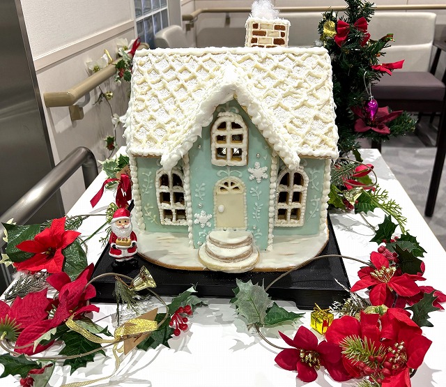 毎年、途中で挫折しかける“お菓子の家”ですが、楽しみに待っていてくださる利用者様や家族様に季節を感じていただきたく今年も作製しました。型紙と模型を作り、雪をイメージした家になっています。